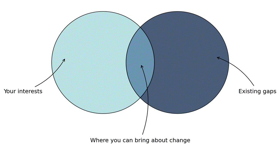 Figure 2: The overlap between your interests and the organizational gaps is where you can bring about change (generated with ChatGPT).