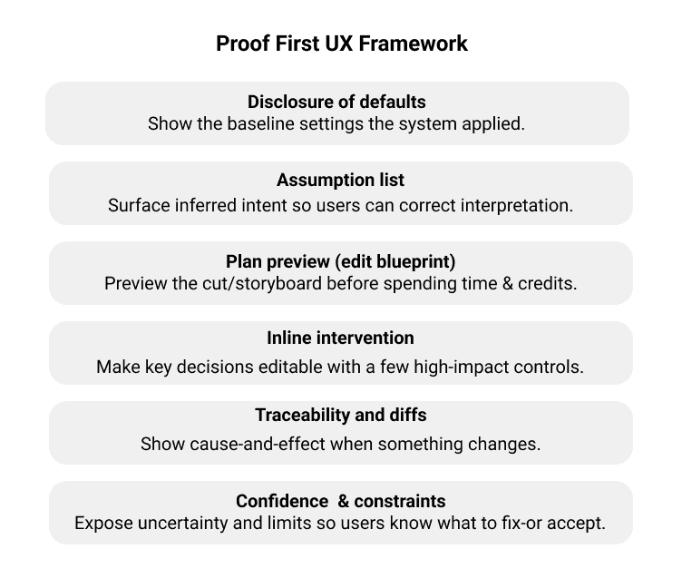 A proof-first UX could make the proof editable so users can adjust key decisions before full generation, such as swapping a shot type, changing pacing for a segment, locking brand colors for captions, choosing a music energy curve, or even enforcing continuity rules such as keeping the same outfit across scenes when swapping a shot type. Inline intervention should help users steer the result with fewer cycles.